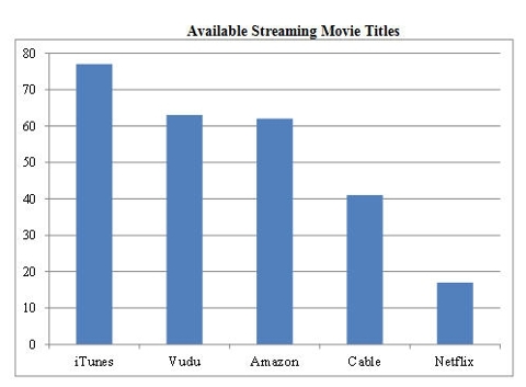 Here's the summary: of these 120 movies (including duplicates), Netflix has a mere 17 (14.2%, and 0% of the current most popular movies) vs. 77 for iTunes (64.2%), 63 for Vudu, 62 for Amazon, and 41 for cable. This chart depicts the results graphically: