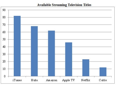 For television, we did a similar comparison, looking at what Netflix offers via streaming vs. competitors' offerings (Netflix and Hulu charge a flat rate, whereas the others typically charge $1 per episode).