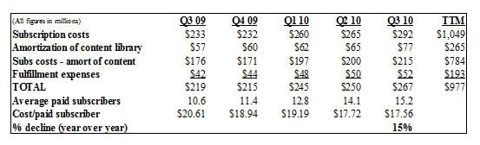 A 15% drop in costs on a 24% decline in usage makes sense to us, as some costs like postage will be purely variable and decline in direct proportion to the decline in DVDs mailed, but other costs are fixed or semi-variable.