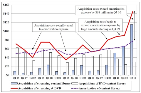 Note that from Q1 2007 through Q3 2009, the two lines parallel each other closely, which makes sense: the amount Netflix spends to acquire content should be amortized over time. (In fact, over these 11 quarters, the amount amortized is 91% of the total amount spent acquiring content - again, what one would expect, given that amortization should lag cash outlays in a rapidly growing business.)