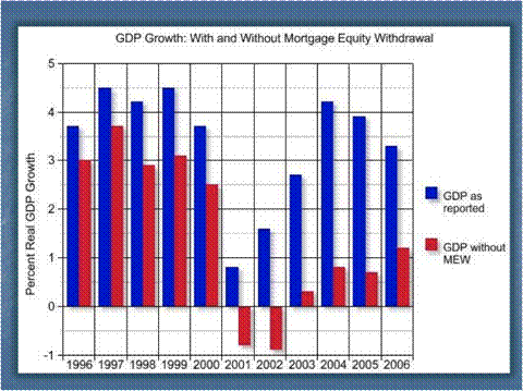 Recall that the Fed Funds Rate was at 3.5% at the beginning of September, 2001. It was cut by 50 bps after 9/11, and was down to 1.75% by the following January (before declining to 1% in July of 2003; see this Fed Funds Rate Chart), so 9/11 accelerated the Fed's easing process early last decade. These lower rates lead to more mortgage equity withdrawals. For an estimate of what economic growth would have looked like in the beginning of the last decade without those mortgage equity withdrawals, take a look at John Mauldin's "Economic Blue Screen of Death" chart below.