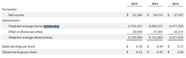 The estimated 300 million unit sales are just 6.6 million shy of AAPL's unit sales in 2015 that brought total sales of $233.7 billion and net income of $53.4 billion. Thus AAPL's numbers in the future will be similar to AAPL's numbers in 2015. Such a stable scenario with the constant decrease in the number of shares outstanding is already a good sign for the long-term investor. The number of outstanding shares has decreased by 6.1% in 2014 and 5.5% in 2015.