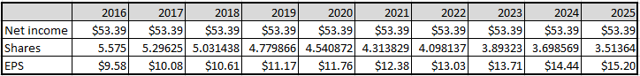 If we estimate a constant decrease in the number of shares outstanding of 5% per year and the above mentioned constant scenario AAPL's EPS would grow at a rate of 4.7% per year.