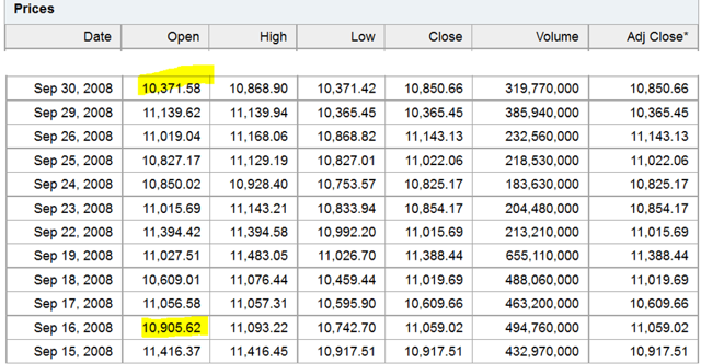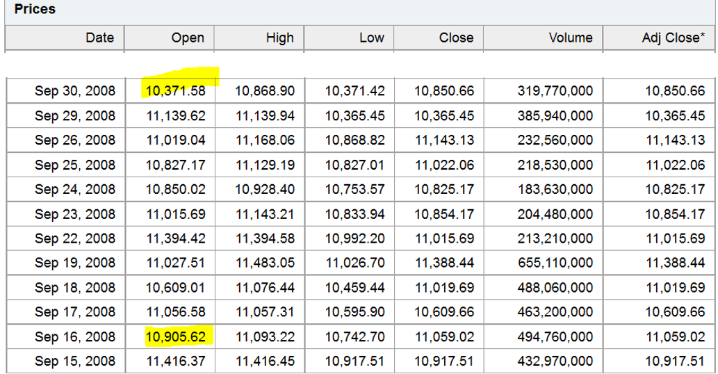 As can be seen from the data, although the Dow fell 500 points after news of Lehman's collapse, it rebounded a bit during the next trading day and closed above its open price on September 16. It wasn't until the end of September when the contagion continued to spread throughout the market that things really fell apart.