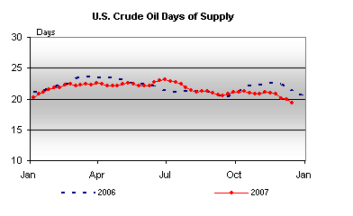Yet the price of oil refuses to sink. Each time oil goes into the high $80s it seems to bounce right back in the face of tight inventories. U.S. crude oil inventories keep sinking – they are now the lowest in nearly three years. This is a chart that indicates the tightness of U.S. oil supplies measured in days of inventory: