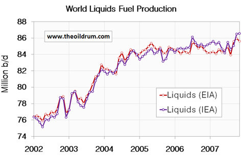 The International Energy Agency recently increased their projection for new oil demand in 2008 from 1.9 mb/d to 2.1 mb/d, a global growth rate of about 2.5%. The IEA tends to be pessimistic about the adequacy of oil supply. OPEC, on the other hand, predicts demand growth of just 1.3 mb/d, which seems designed to justify their producing less oil than the IEA would like. See discussion above re: hoarding.