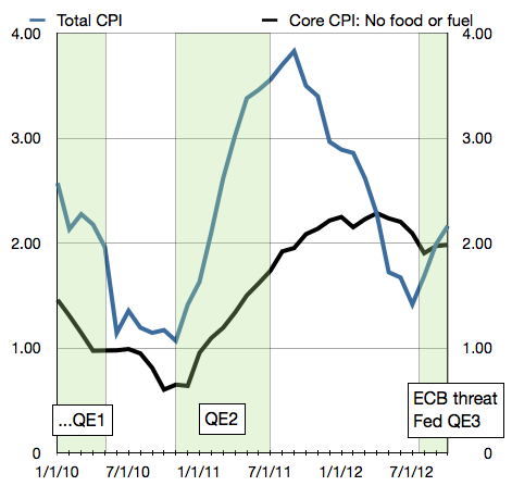 That last part -it turns out- is very important. Stock market perma-bulls (equity fund managers, for the most part) will point to this statement and suggest it means the Fed may further still enlarge QE4 to a QE5 in the future. I suggest that's not likely what the Fed meant (but it is probably happy to get a free lunch from any over-optimism this generates). Just as the U.S. Congress has the "fiscal cliff" as political cover for introducing unpopular yet responsible fiscal policy in 2013, the Fed needs cover too. It will come in the form of inflation. The cold reality is each time QE is launched, we get less wealth effect bang for the buck, and more inflation. The following chart makes this clear. (Note: I'm using CPI because everyone is familiar with it.)
