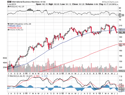 Recently, Oracle (NYSE:ORCL) reported disappointing results, which was partly attributable to weakness in the hardware segment. IBM should also report weakness in this segment when it reports second quarter earnings. The street has been lowering its expectations for the quarter. The disappointing results from Accenture (NYSE:ACN) suggested IBM may also report a weak quarter.