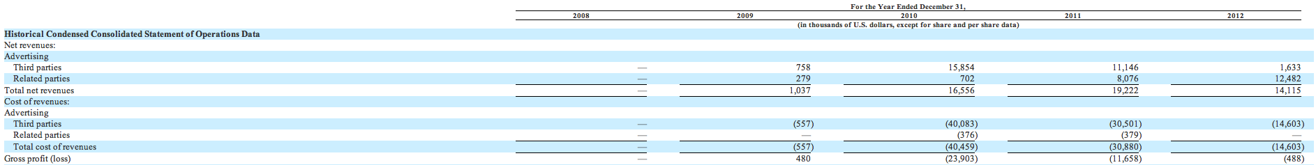 Ku6 is just below YouKu (NYSE:YOKU), which has a market cap of nearly $5 billion. YouKu has a very similar platform to Ku6 but generated ~$310mm in revenues over the last 12 months, compared to just $12mm for Ku6. Just based on traffic it appears that Ku6 has been doing something right, and especially when one considers that it changed the business model in 2011. It is effectively a 2.5 year old company.