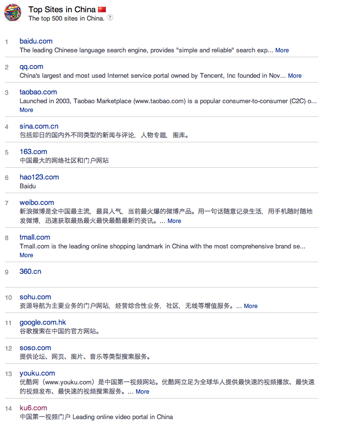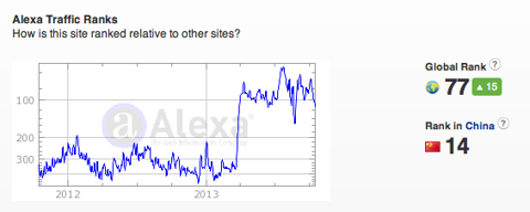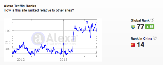 According to Alexa, the site has seen traffic has been increasing very rapidly in 2013. It is now the 14th most visited site in China and the 77th most visited site in the world.