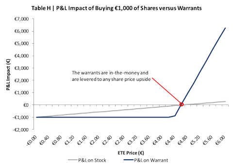 See below the potential trade value on buying an equal dollar amount of warrants versus shares.