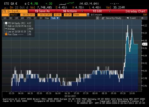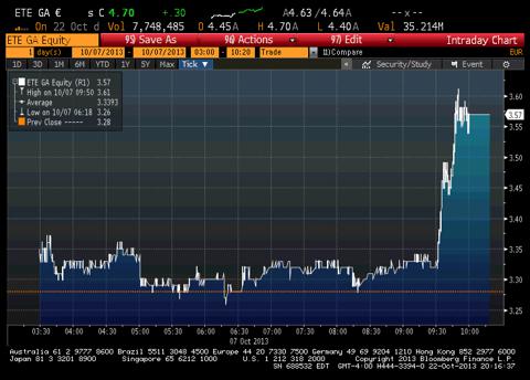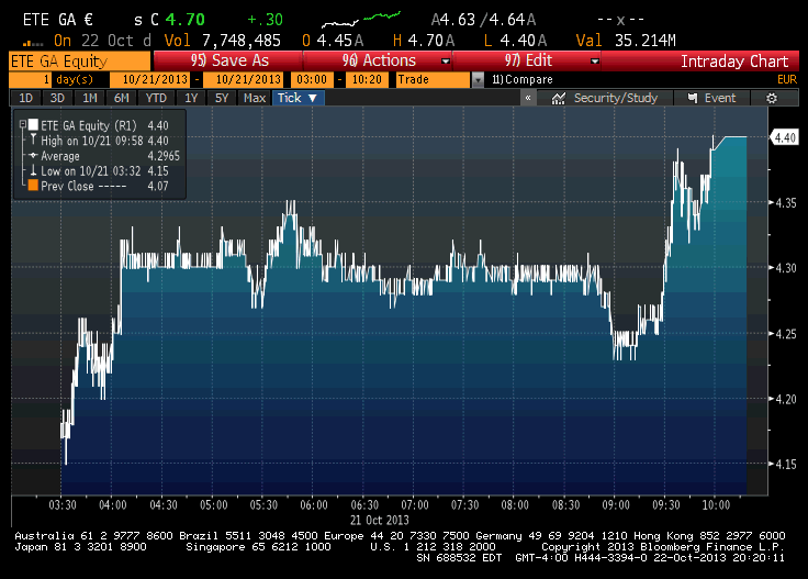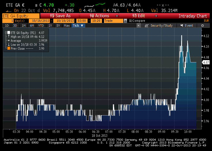 A similar dynamic appears to be occurring with U.S. retail investors and day traders buying the common stock of NBG. As can be seen in the following chart, the price of the Greece common share trades in a reasonable manner throughout the Greek trading day, but rises significantly (nearly 10%) upon opening of the U.S. market (see 9:30 time on 7-Oct-13).