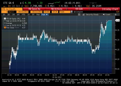 So naturally, what do retail investors do? They follow the leader and buy shares that they believe will benefit from a recovery in Greece. Given that NBG is the most visible and liquid way for U.S investors to invest in Greece due to a liquid and actively traded ADR, NBG became the darling. Since October 1st, NBG stock is up 56% and the volume is 165% higher than it has been over previous 3 months.