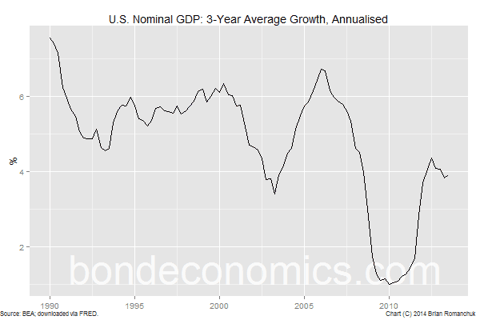 At present, it seems that 3-4% represents a lower bound for average nominal GDP growth for the U.S. and Canada, and probably other countries as well (assuming they avoid replicating the policy errors of the Euro periphery). Even in this period of sluggish growth, average U.S. nominal GDP growth is running at 4%, although the last recession did manage to drop the 3-year average to 1% for a short period (chart above).