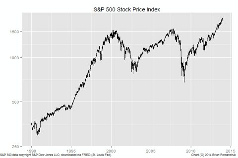 Although equities have outperformed bonds on very long horizons, they have also underperformed for extended periods. If you bought the S&P 500 at the top of the market in March 2000, your returns to present have been pitiful (chart above; stock prices have risen at 1.3% annualised since the peak in 2000, but investors would have also received dividends to augment their returns).