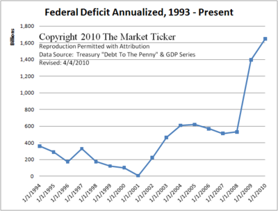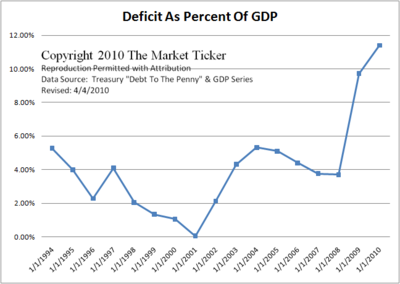 Contrast this with the 1990s when private demand rose fast enough that the government was able to slowly withdraw stimulus via deficit spending, to the point that it actually approached zero! That's REAL economic growth. But now we've gone even further, and in the last two calendar years have put up nearly 10% and nearly 12% of GDP distortions, respectively. Let me remind everyone that in the world of economics a 10% economic contraction is the formal definition of economic Depression; ergo, we have been in one for the last two years and are today!