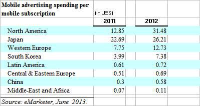 The table states the obvious: North America, Europe and Japan comprise the overwhelming majority of mobile ad spending. They are also responsible for the largest amount of nominal growth.