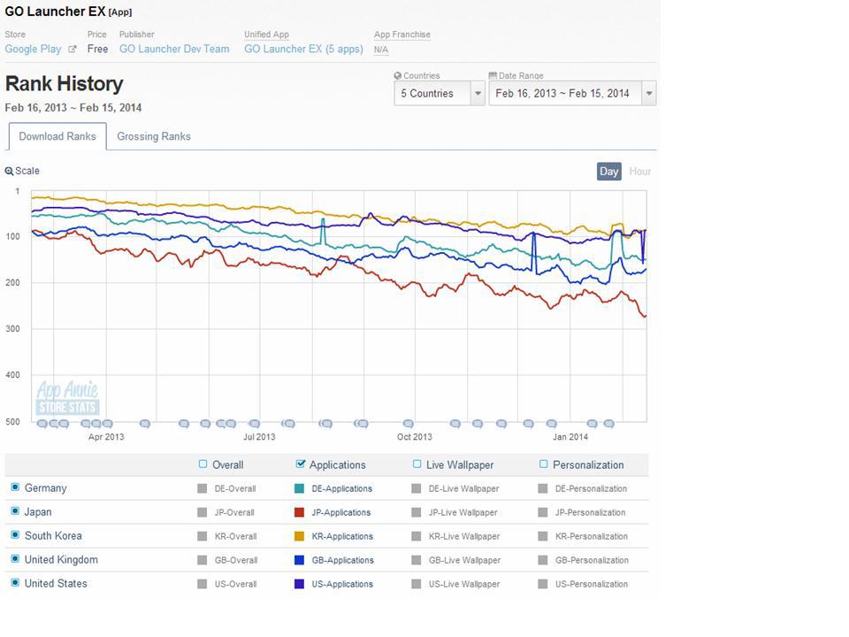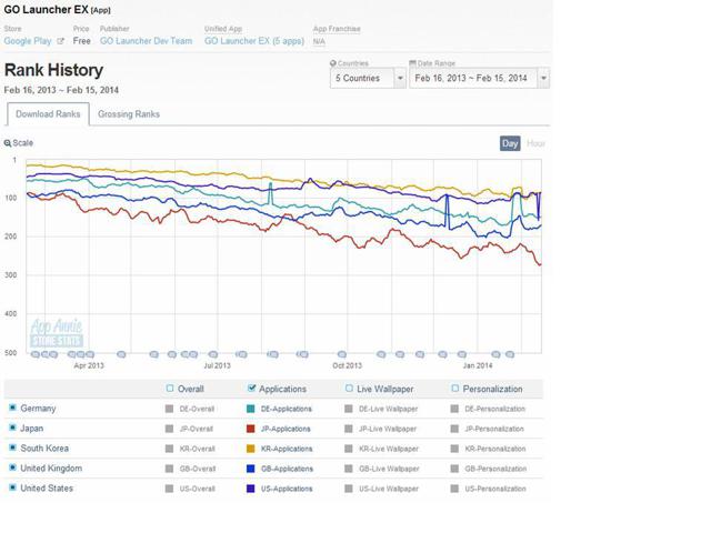 The scale of the chart above (from 0-500) tends to understate the size of the declines in downloads. But by looking closer, one can see that Go Launcher Ex was largely a roughly top 50 product just a year ago (as was indicated in the IPO prospectus) but it has now fallen to being largely a top 100-200 app (with the exception of South Korea). The impact between a top 50 and a top 200 is typically exponential, not linear, such that the effect on subsequent revenues from paid downloads and ad spending will by necessity be dramatic. This will likely become clear in Sungy's first 20F filing as a public company, which will be released in a few weeks.