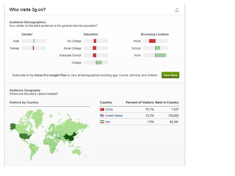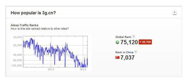 Detailed web statistics can be found for 3G.cn by searching at Alexa.com. As expected, the vast majority of traffic comes to this site from within China.