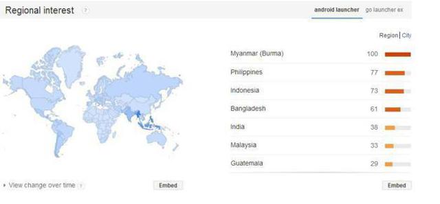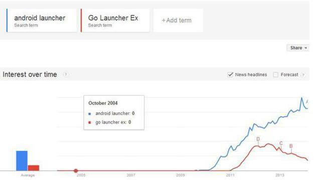 The above screen shots can be replicated by going to Google Trends and entering the search terms "android launcher" and "Go Launcher Ex" as shown above.