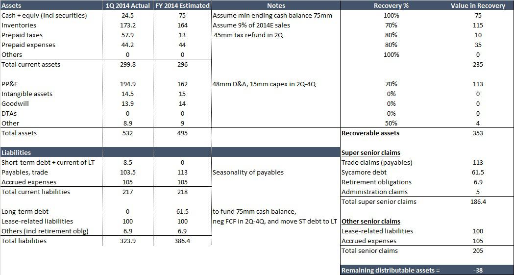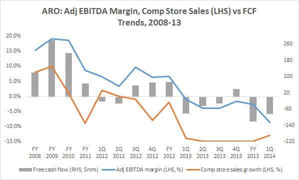 At $3.2, ARO currently trades at 1.2x last reported shareholder's equity ($250mm market cap on $208mm book equity). In the scenario I mentioned above - some moderation in SSS declines over the next three quarters, plus net 117 stores closed this year - I see the company burning through another ~$108mm in shareholder's equity (ie, net losses) over the next three quarters (after losing ~$77mm in 1Q): this is a full 43% of ARO's current market value. That suggests book equity will be around $100mm at fiscal year end (excluding FX, other accounting adjustments to equity, as well as potential equity raises which are a long shot at this stage). This suggests that if the book multiple stays the same - 1.2x - the stock price should naturally devolve to a much lower level, along with the decreasing net asset value: that is, to 1.2x of 2014 end proforma net assets, or $1.5 per share. Even if we assume the book multiple expands - due to a lower base, and perhaps if the business shows some stabilization - even at say 1.8x book, that implies $2.3 a share - still 30% below the current price; and again, it is most likely that the company will continue to burn net assets and cash next year as well.