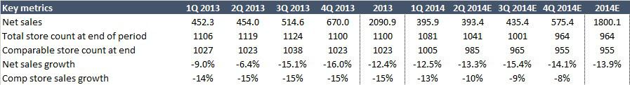 Firstly though - in the face of the rapidly declining top line, will these cost savings really move the needle? It's important to note at this juncture that ARO has only closed 1 store so far (as of end of 1Q, 2014). From the 1Q 10-Q (my italics):