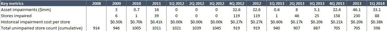 - there are plenty more 'impaired' stores left to close: looking at all the asset impairments over the past 4-5 years, we can tally how many stores have been impaired since the business started going south. Working from two assumptions - namely, that stores only get impaired once; and that once impaired, it becomes a more likely candidate for closure - we can see that the population of poorly-performing stores is pretty large. ARO has impaired a total of 483 stores since 2009, leaving an additional 358 store population of potential closures, even after the 125 slated for closure this year. Even if only 150-200 of this population is really considered for closure, that is still a very large part of the footprint to remove.