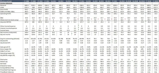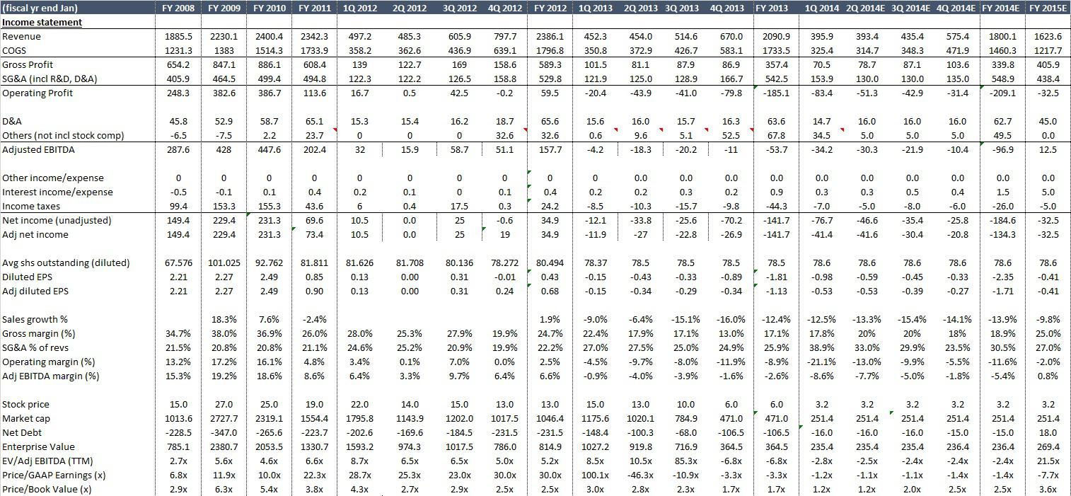 Here is how my model comes out (showing historical years, as well as how I think 2014 ends as well, for comparison) with the above assumptions: