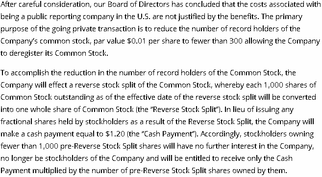 On May 9th, 2014, Hancock Fabrics (OTCQB:HKFI) proposed a similar announcement. Thus they decided that the cost of being a public company were not justified by the benefits. Their end goal (as similar to KCLI'S was to deregister the common stock). I have provided the summary of the deal below.