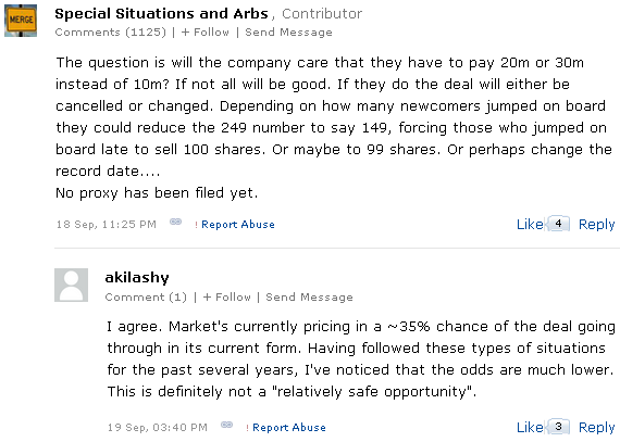 The premise of the article was taking advantage of the odd lot tender offer to make ~20% in the short-run. I have no idea how many views DeMuth's article got, but it did get a decent amount of comments (and even negative publicity on another blog site, talked about later). We cannot be 100% sure if the article was the reason why the deal fell through. If I was to bet though, I would bet high that DeMuth's article was a key reason why the deal fell through (as do other bloggers).