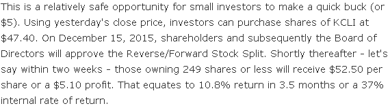 KCLI estimated originally that they will have to pay for ~0.2mm shares which equates out to ~$10mm in cash. That is also around 800 holders of 249 shares. If you take a look at the recent volume action, this will mostly likely be a lot higher.