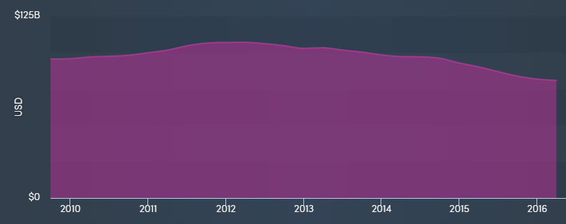 This is IBM's revenue since 2010 and you can see around the end of 2011 it all started to go wrong. IBM has continuously posted lower and lower revenue since that time while management twiddled its thumbs and just kept buying back stock. The results have been disastrous and until IBM finds a way to make this chart look better, the stock is going to have a downward bias.