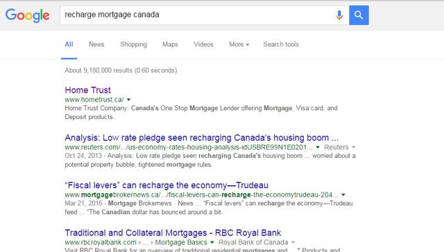 A simple Google search of "recharge mortgage Canada" led us to a startling revelation. Despite never being mentioned in Home Capital Group filings, the genius algorithm at Google appears to have connected the dots between the search phrase "Recharge Mortgage Canada" and "Home Trust" - the operating subsidiary for Home Capital Group.