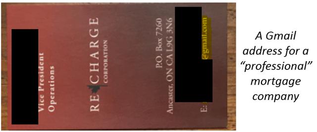 Despite being currently registered in the province of Ontario as a "Mortgage Broker", Re-Charge has no website and no signage on their office (see Photo A below). At least one employee of Re-Charge has an @gmail.com address listed on his business card (see Photo B below).