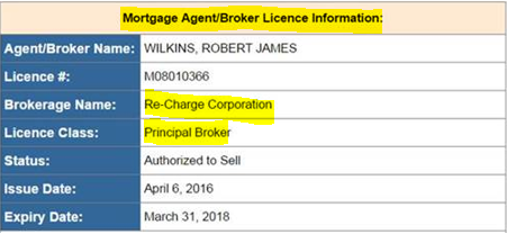 We did a quick mortgage agent broker check and found Mr. Wilkins listed as the Principal Broker on the Re-Charge account: