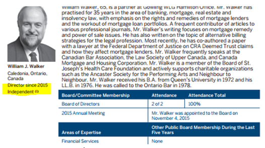 As folks who follow Home Capital Group will probably recall, we were first introduced to Home Capital Group's most recent board addition in a somewhat unorthodox fashion. During the turmoil surrounding the company in the summer of 2015 when the company disclosed their involvement in what would become at least $1.9 billion in fraudulently originated mortgages, two longtime HCG board members resigned. To fill one the vacated seats, the company appointed William J. Walker as an independent director. Oddly though, there was no separate press release or regulatory filing announcement regarding his appointment. Shareholders were made aware of this material event via a very brief mention at the end of the prepared remarks on the Q3 2015 earnings conference call by Mr. Soloway: