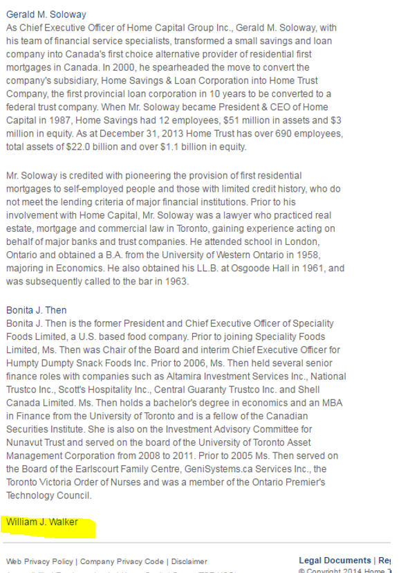HCG lists its board of directors on two different websites- one for the main operating subsidiary (Home Trust), and one for the publicly traded holding company (Home Capital Group). The first one (Home Trust) does not use hyperlinks, rather it simply lists the director's bio under their respective names. Curiously, for William J. Walker, we only see his name with the page abruptly cut off. On the second version of the bio page on the Home Capital website, if you try to click on the link for William J Walker, nothing happens. Unlike other board members, the bio doesn't appear in newly launched window. ( Author note: this was true as of our final publication on 8/22/16).