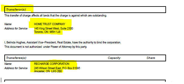 We sent our team of researchers to the Canadian Land Registry Office to try to find out more about Re-Charge Mortgage. We wondered - could we find any ties between Re-Charge and Home Capital Group?