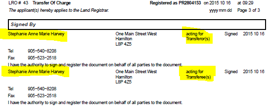 Harvey, as you can see below, acted as both the Transferor(s) and the Transferee(s) of the loans on behalf of GLH Limited Partnership (GLH..i.e. Gowling Lafleur Henderson). Harvey is currently an associate at Mr. Walker's law firm, Gowling and currently "practices in the area of banking and insolvency law, with a particular emphasis on the rights and remedies of mortgage lenders." Furthermore, she is a member of the "Recovery Services Group" which among other things, " helps clients ensure a speedy and effective resolution of their defaulting mortgages."