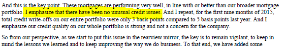 As you can see below, HCG has repeatedly kept to the party line that all those loans were performing BETTER than the company average (how the company defines "better" than its supposedly near-perfect default experience is a topic for another day). When asked why they didn't need to take provisions higher in the wake of the fraud disclosure, management has repeatedly made comments like the one below:
