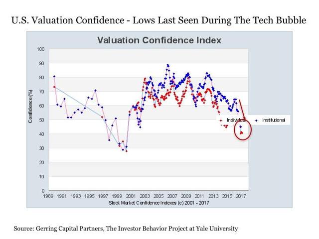 Let's first consider the U.S. Valuation Confidence Index, which is shown the chart below. This index is based on a question asked to both institutional and wealthy individual investors regarding stock prices (NYSEARCA:SPY) and how they are priced when compared to "true fundamental value" or "sensible investment value." The Index measures the percentage of the survey population that thinks the stock market is not too high from a valuation perspective. Thus, the lower the reading, the more respondents think the stock market is overvalued.