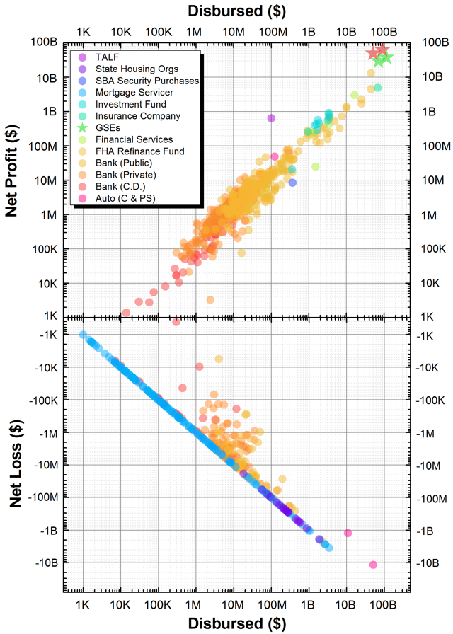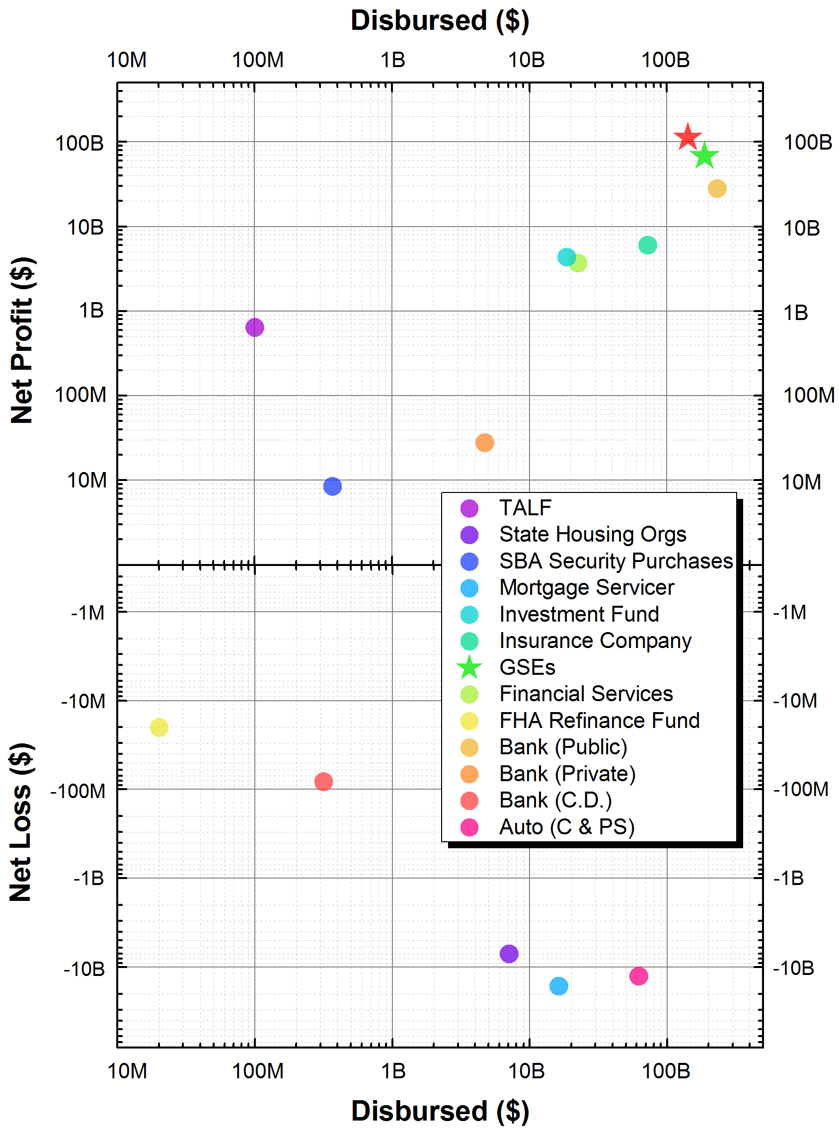 Figure 1 - Net profit/loss amounts of all 13 organizational types as a function of disbursed amounts. Red star denotes GSE data accounting for pre-NWS dividends (see text). Data source is ProPublica.