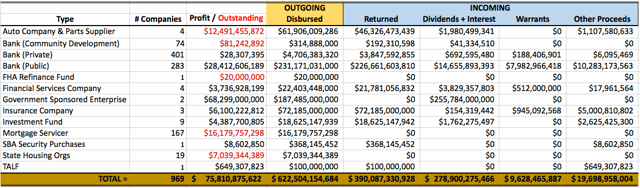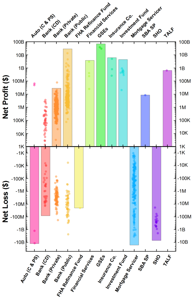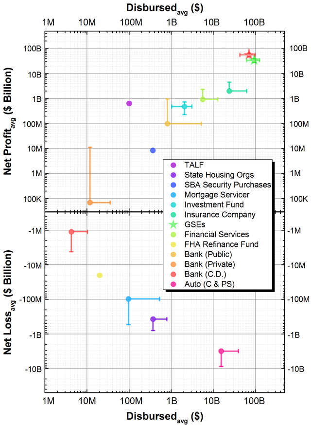 Regardless, Figure 1 shows that public banks were given more ($231.2 billion) and returned less ($28.4 billion) than the GSEs. The GSEs rank 2nd in amount disbursed but 1st in net profit. Six other types of organizations were disbursed less and returned less: TALF, SBA security purchases, private banks, investment funds, insurance companies and financial services companies. The former three were given smaller bailouts of $100 million - $5 billion and returned less than $1 billion in profit; the latter three were given larger bailouts of $10-75 billion and returned less than $1 billion in profit also.