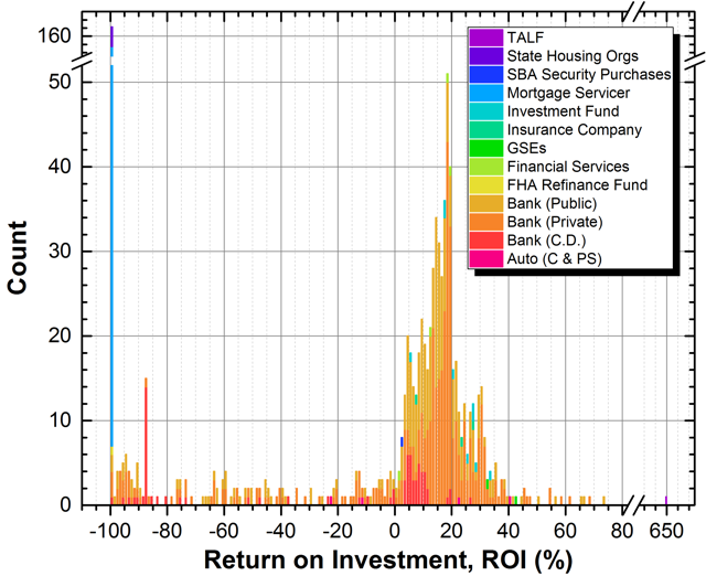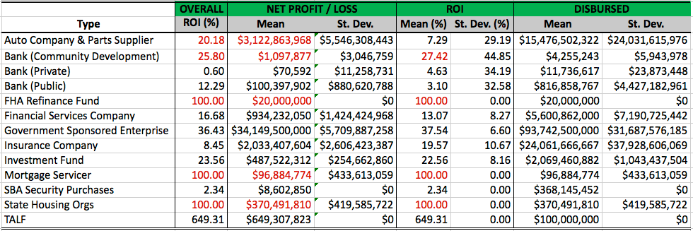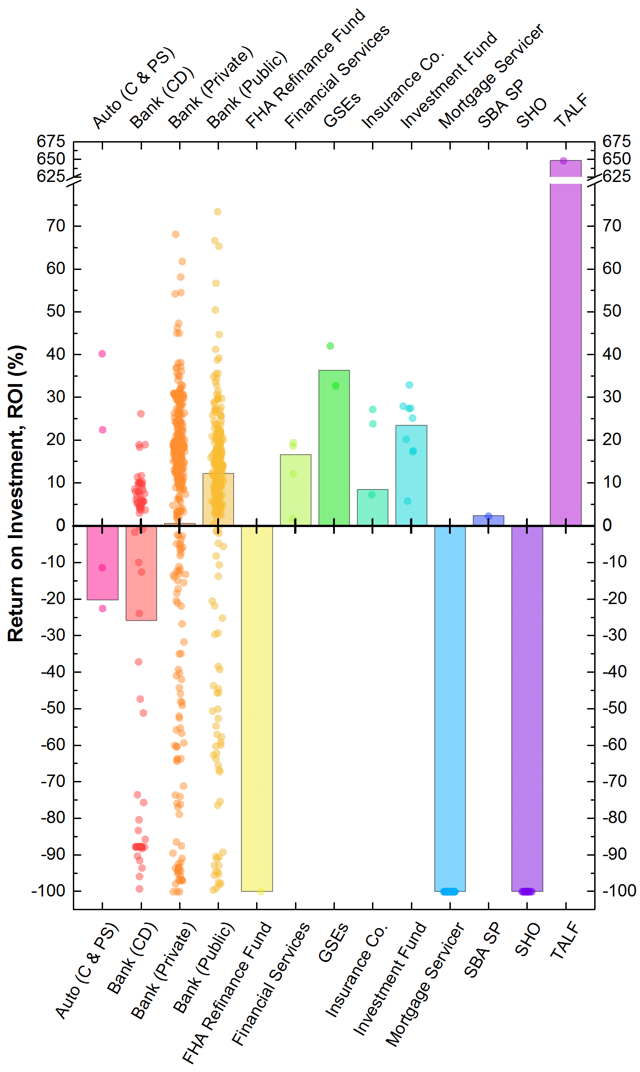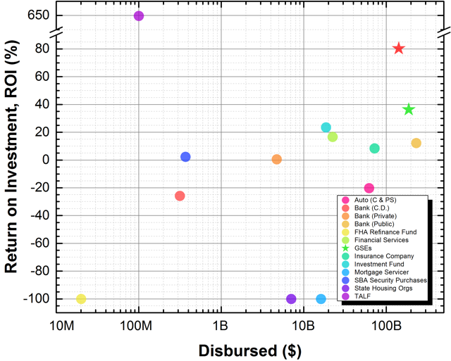 As expected, Figure 2 shows that the GSEs have a higher ROI than all other organizational types as a whole, excluding TALF. TALF had the highest return (649%) but was on a much smaller disbursed amount (and return) than the GSEs. Four of the seven types that yielded a profitable return made over $1 billion in profits: public banks, insurance companies, financial services, and investment funds. The latter two gave a higher return (15-25%) on a much smaller investment (< $25 billion), while the former two gave a smaller return (7-14%) on larger investments (~ $70 B and $230 B).