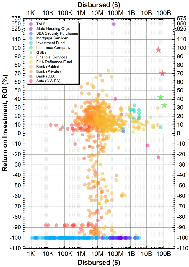 Apart from TALF, this is composed of 9 private banks and 6 public banks for Freddie Mac and 1 investment fund, 1 auto company & parts supplier, 20 private banks and 15 public banks for Fannie Mae. The disbursed (and returned) amounts of these companies is much lower: ~$1M-$2B (Fannie Mae) and ~$1-100M (Freddie Mac). The ROI for the GSEs are pretty remarkable: only 2.6% and 6.3% of profitable bailouts (1.7% and 3.9% of all other bailouts) have higher ROI than Freddie Mac and Fannie Mae!