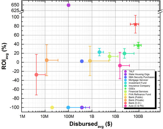 Figure 8 - Average return on investment (ROI) as a function of average disbursed amount for all 13 organizational types. Red star denotes GSE data accounting for pre-NWS dividends, while red star does not (see text). Negative disbursed uncertainty bar not displayed for some data for visual clarity. Data source is ProPublica.