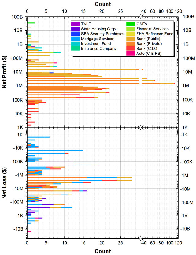 Figure 7 shows that the GSEs is the only type with a net profit above $10 B; insurance companies are the only other above $1 B, while 4 others have an average net profit in the range of $100 M-$1 B. The GSEs have returned on average 16.8x more profits than insurance companies and 36.6x more than financial services organizations.