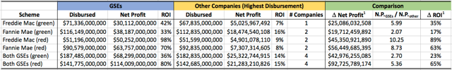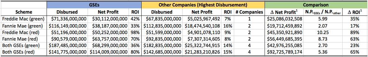 Comparison data for this scenario is shown below in Table 3 for the 'green' and 'red' scenarios for each GSE and them combined. The table shows that for green star data, both Fannie and Freddie have given Treasury $8.9-9.2 billion (1.31-1.44x) more than the other 187 and 387 companies; this equates to the GSEs giving 9-13% more ROI than other companies for the same disbursement!