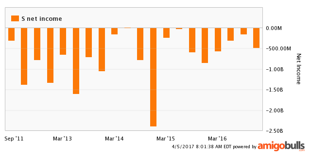 The graph above shows their revenue over the last three years compared to their competitors. Sprint's revenue has not shown any growth over this period. Instead, it has remained steady at around $8 billion since 2014. Also, their revenue is below the revenue of their competitors over this time period. In fact, the revenue of their competitors is high and shows growth, while Sprint's revenue has been without growth or improvement of any kind. The graph below shows Sprint's net income since 2011. These results show that they have actually had a net loss every quarter since 2011, which is an indicator that the company is in a very bad financial position. Their highest net loss occurred in 2015, reaching almost negative $2.5 billion.