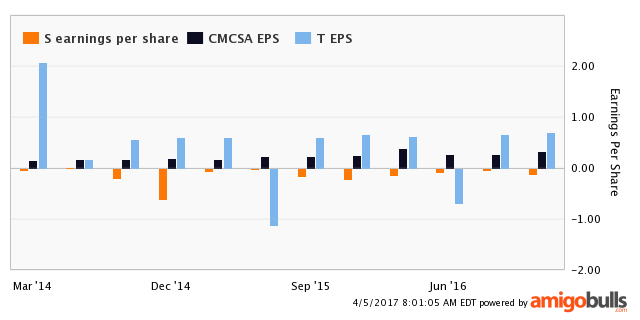 The graph below shows Sprint's earnings per share compared with Comcast and AT&T over the last three years. Investors want a company that has a high earnings per share. Sprint does not meet that requirement because they have had negative earnings per share over this period. This follows the same negative trend that their net income showed. With the exception of two quarters for AT&T, Sprint's earnings per share has been below their competitors. Overall, Sprint has shown a very poor financial performance compared to their industry peers over the last few years.